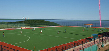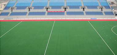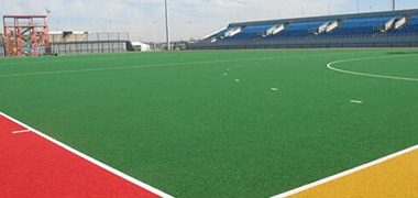 專業(yè)的曲棍球面層鋪裝人造草坪場(chǎng)地平整,良好的保水性,透水性有完整的排水系統(tǒng)
