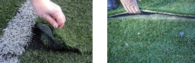 對于草坪接縫處和接合處應(yīng)當(dāng)每周檢查一次,因?yàn)榻涌p處或接合處容易松動,導(dǎo)致運(yùn)動員絆倒,引起危險。如果長度超過 300mm,則應(yīng)當(dāng)通知場地鋪設(shè)商,以避免裂縫進(jìn)一步擴(kuò)大。