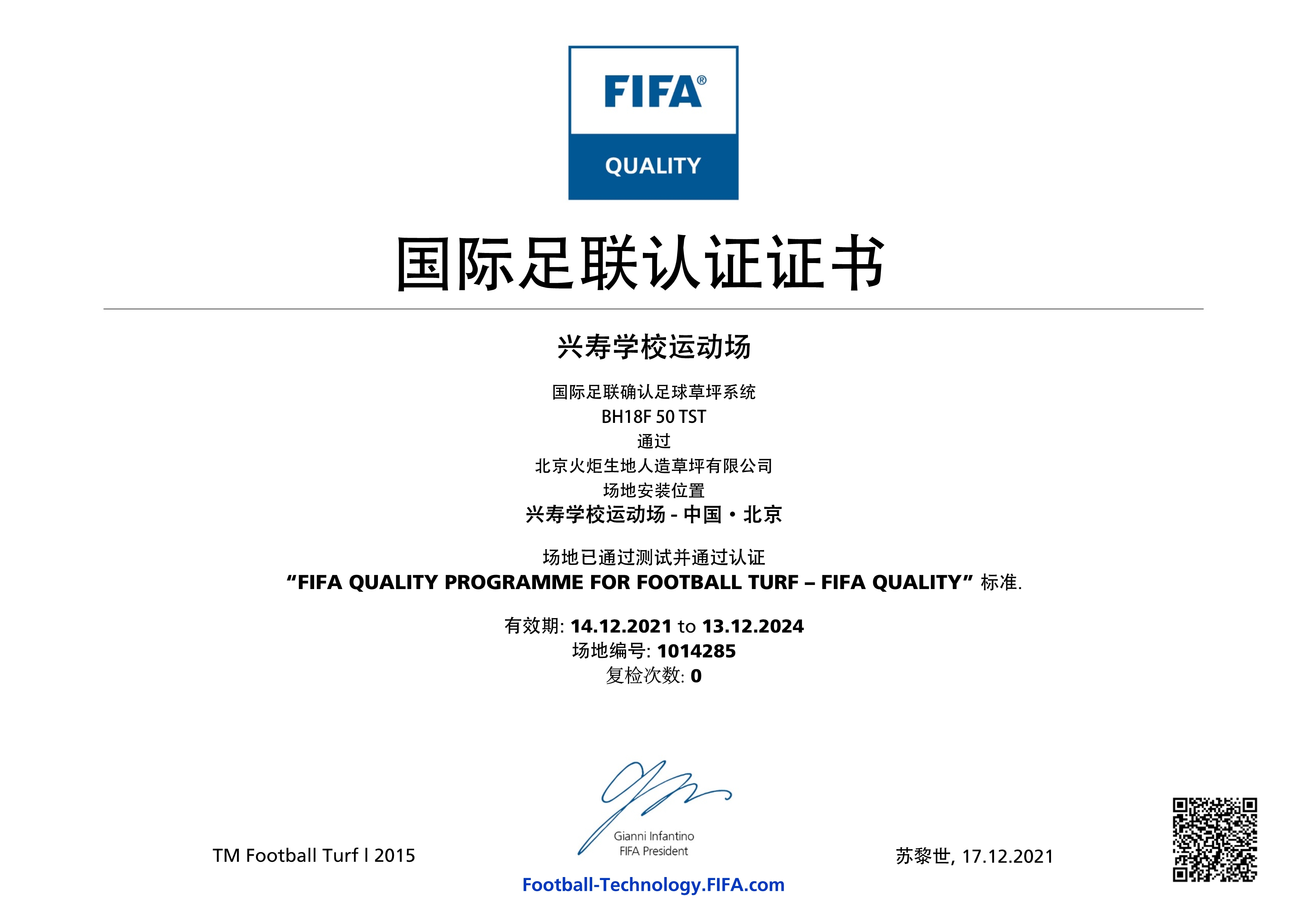 近日,北京市昌平區(qū)興壽學(xué)校運(yùn)動(dòng)場(chǎng)地已通過(guò) FIFA(國(guó)際足聯(lián))人造草坪足球場(chǎng)地質(zhì)量檢測(cè),榮獲 FIFA Quality認(rèn)證證書(shū)。