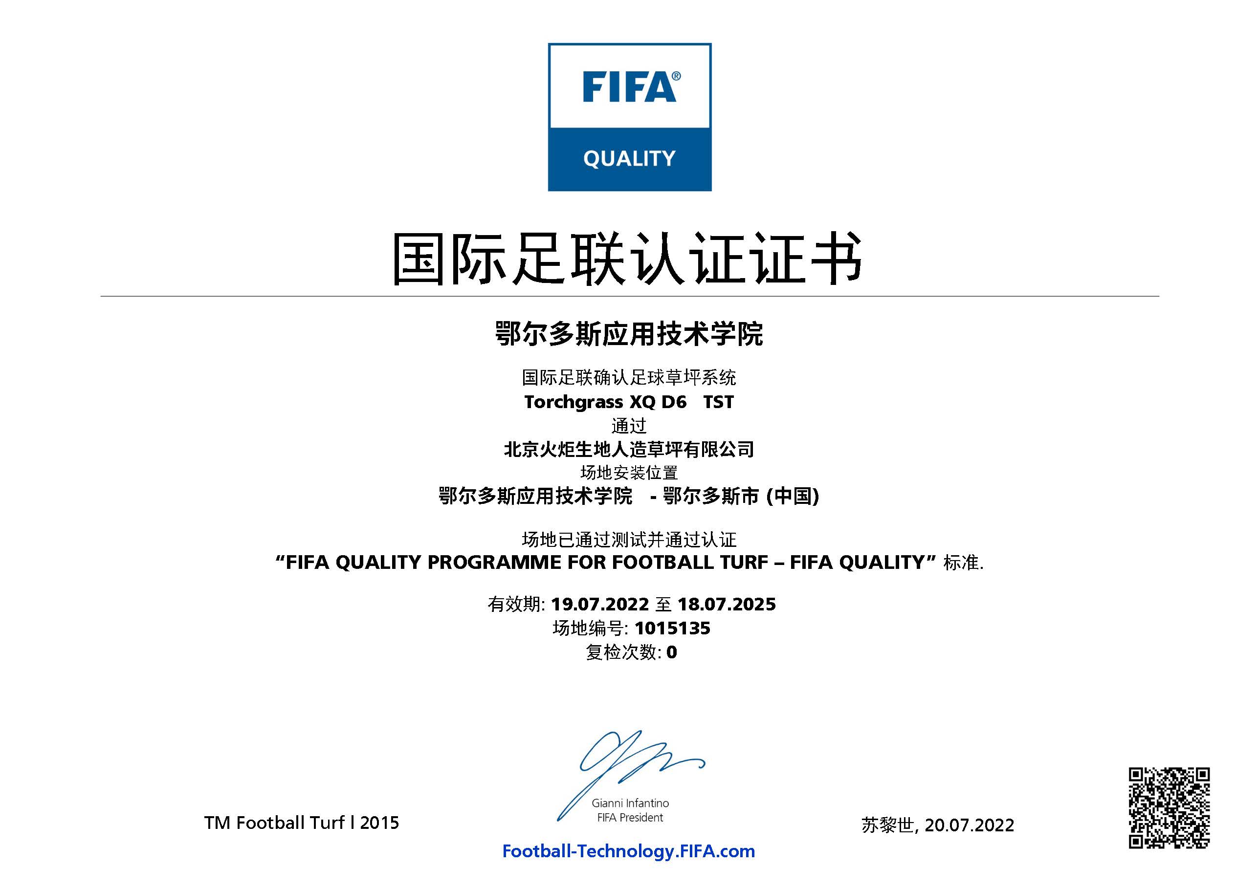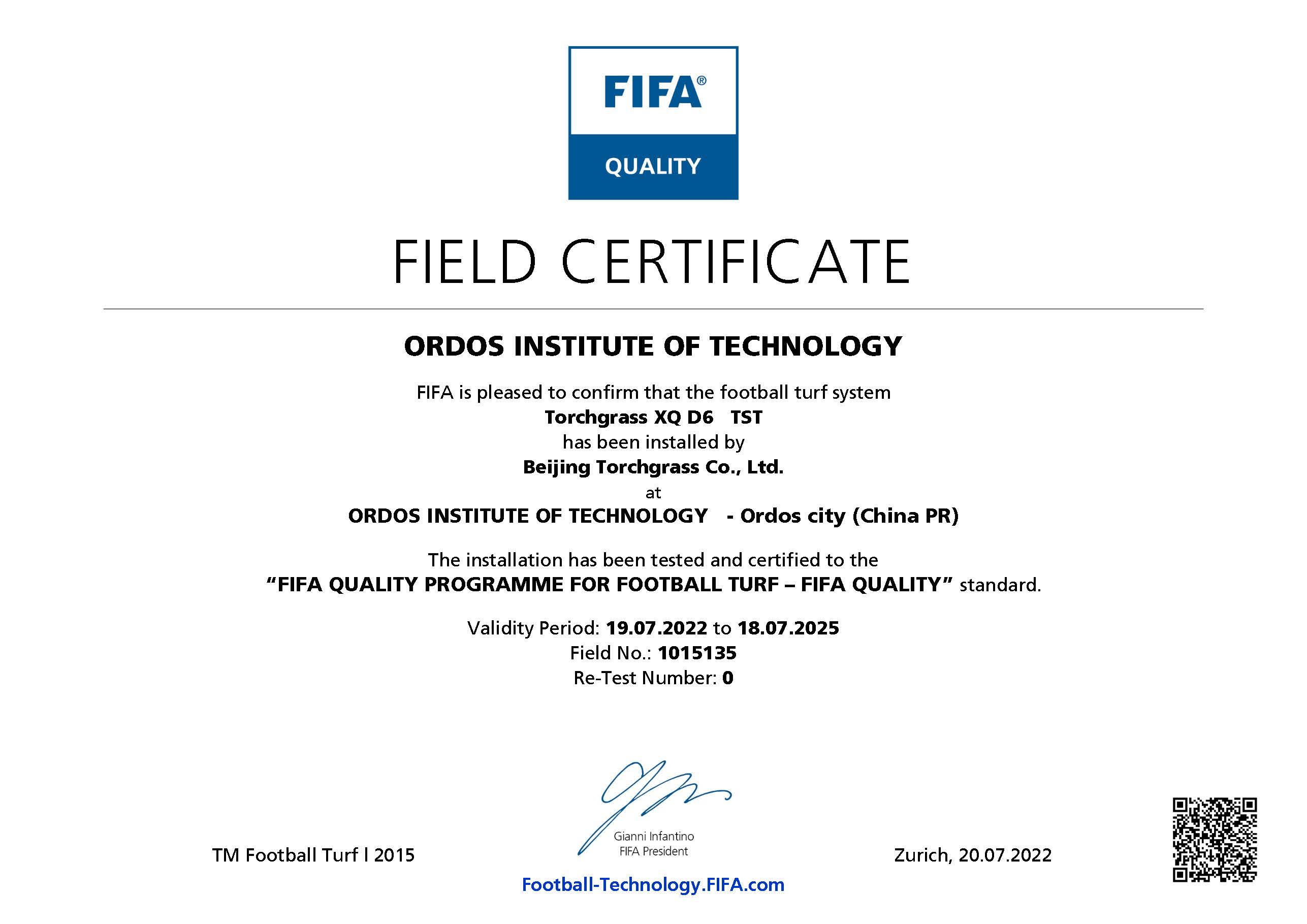 近日,鄂爾多斯應(yīng)用技術(shù)學(xué)院足球場(chǎng)地已通過(guò) FIFA(國(guó)際足聯(lián))人造草坪足球場(chǎng)地質(zhì)量檢測(cè),榮獲 FIFA Quality認(rèn)證證書(shū)。