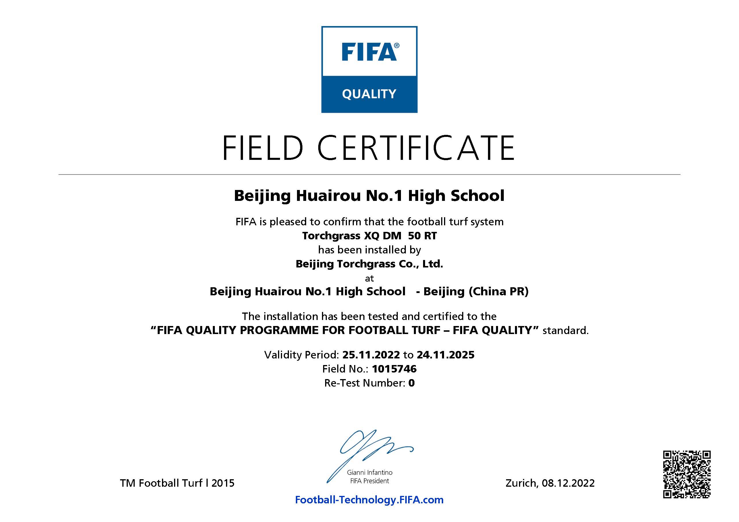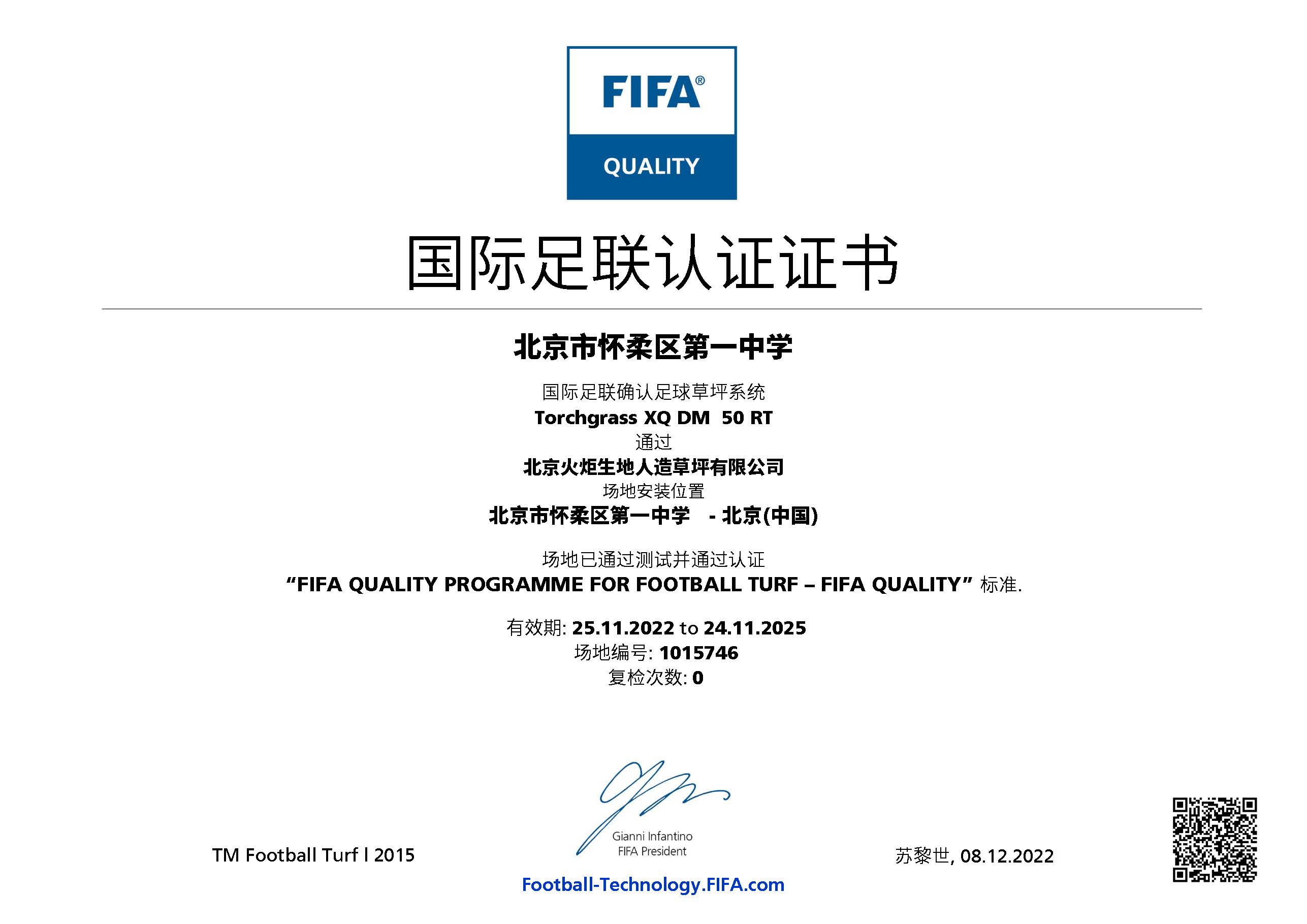 近日,北京市懷柔區(qū)第一中學足球場已通過 FIFA(國際足聯(lián))人造草坪足球場地質(zhì)量標準的測試,榮獲 FIFA Quality 認證證書。