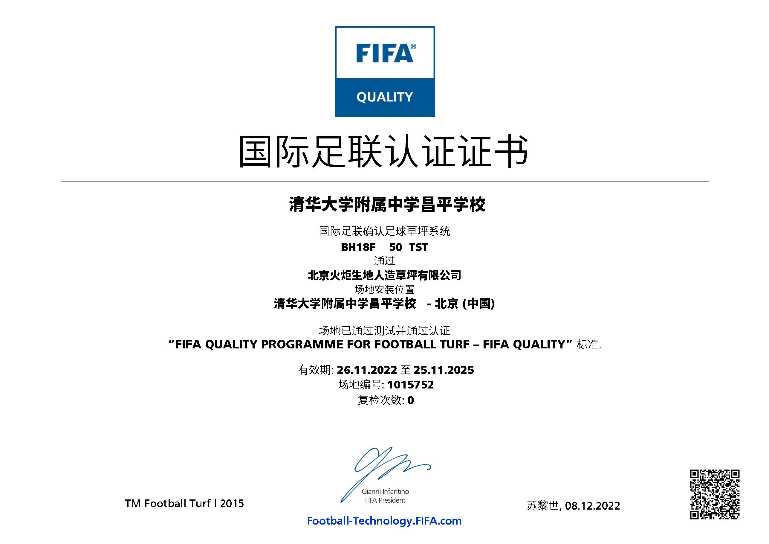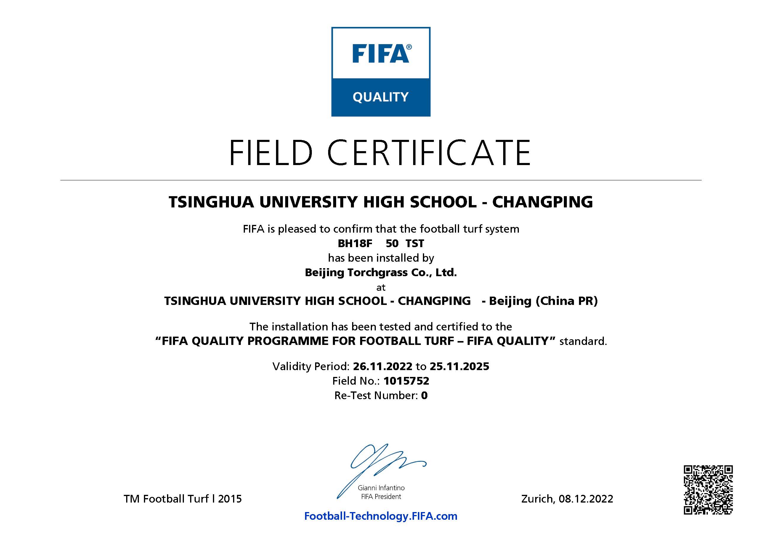 近日,清華大學(xué)附屬中學(xué)昌平學(xué)校足球場已通過 FIFA(國際足聯(lián))人造草坪足球場地質(zhì)量標準的測試,榮獲 FIFA Quality 認證證書。