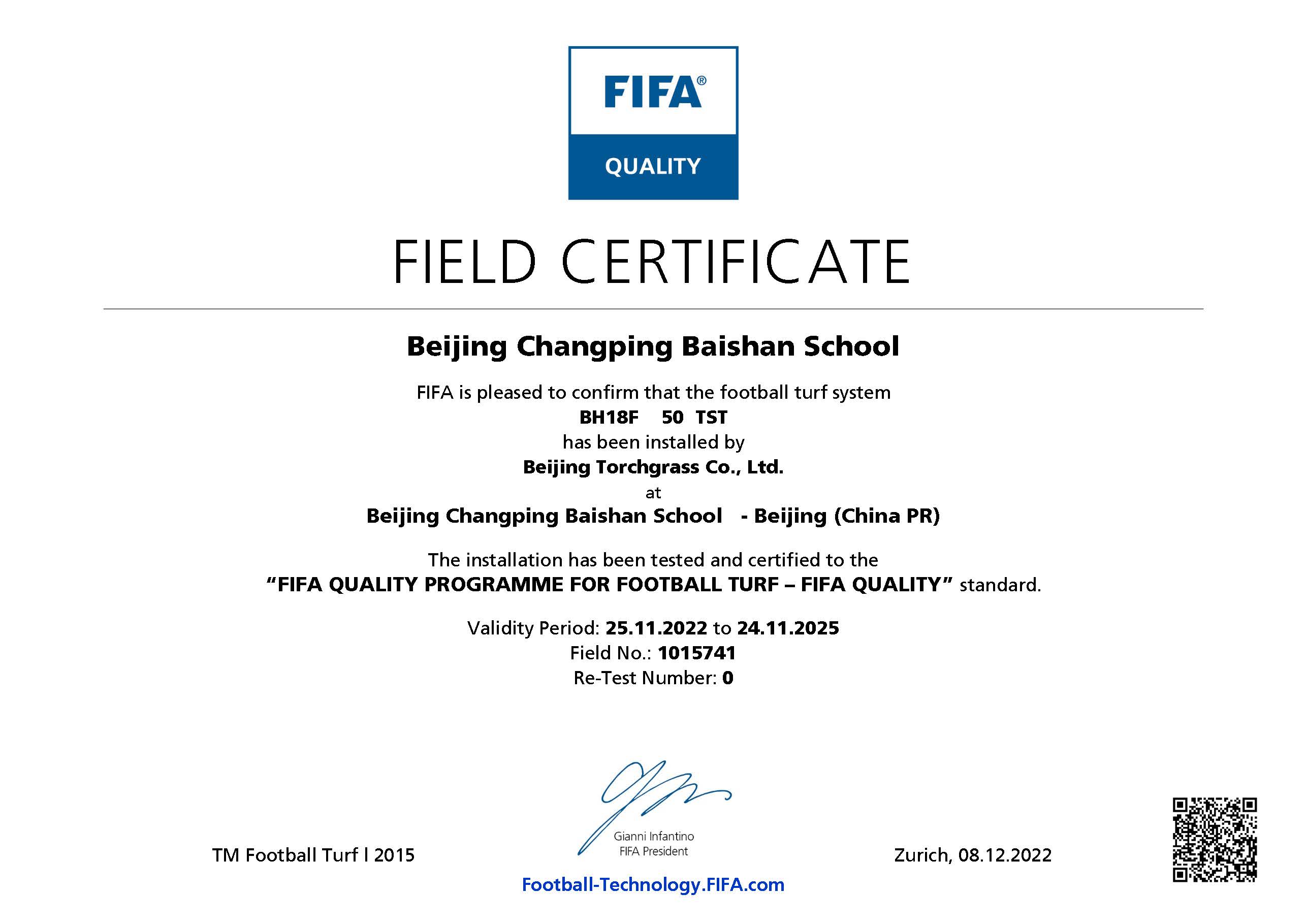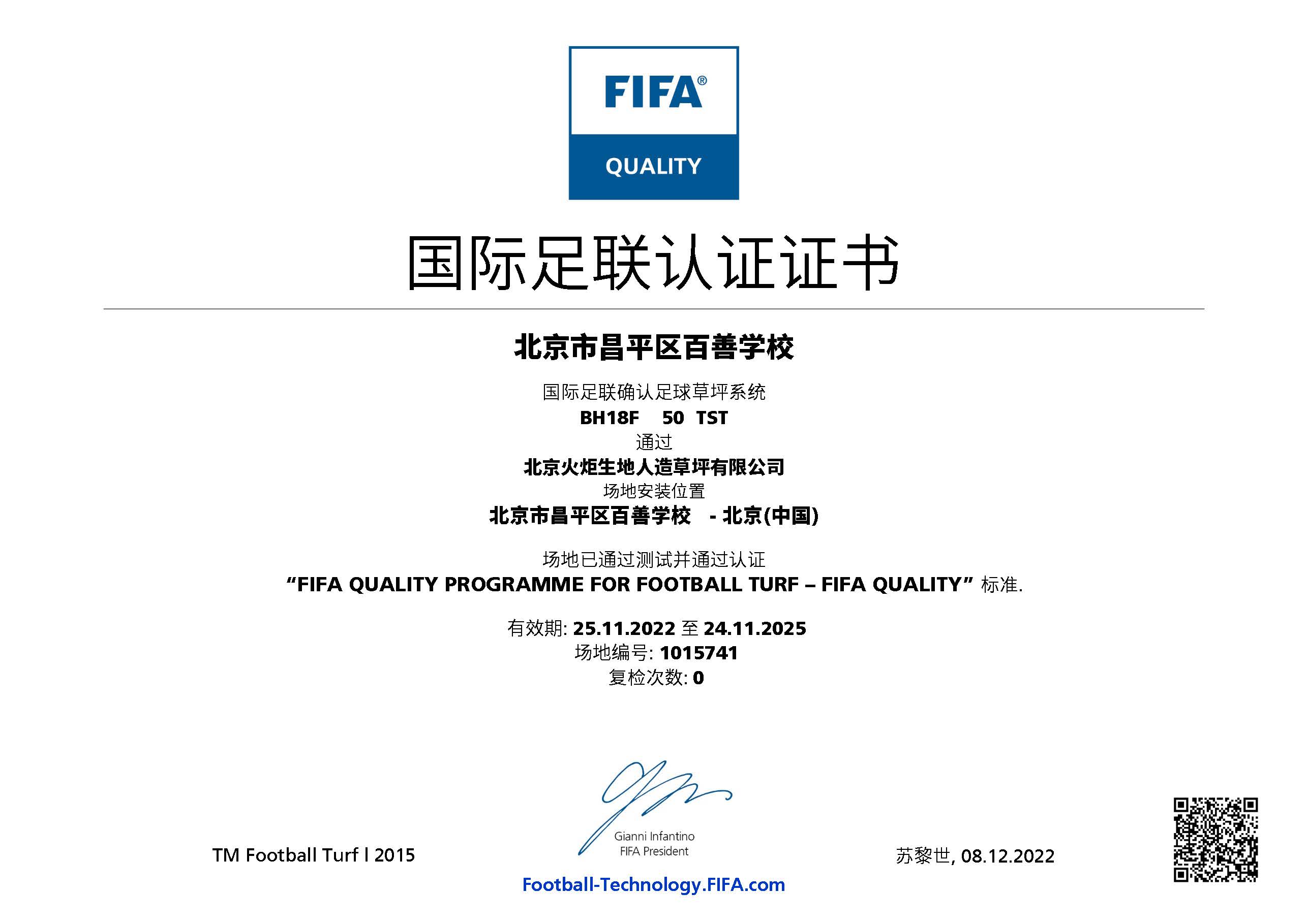 近日,北京市昌平區(qū)百善學(xué)校足球場(chǎng)已通過(guò) FIFA(國(guó)際足聯(lián))人造草坪足球場(chǎng)地質(zhì)量標(biāo)準(zhǔn)的測(cè)試,榮獲 FIFA Quality 認(rèn)證證書。