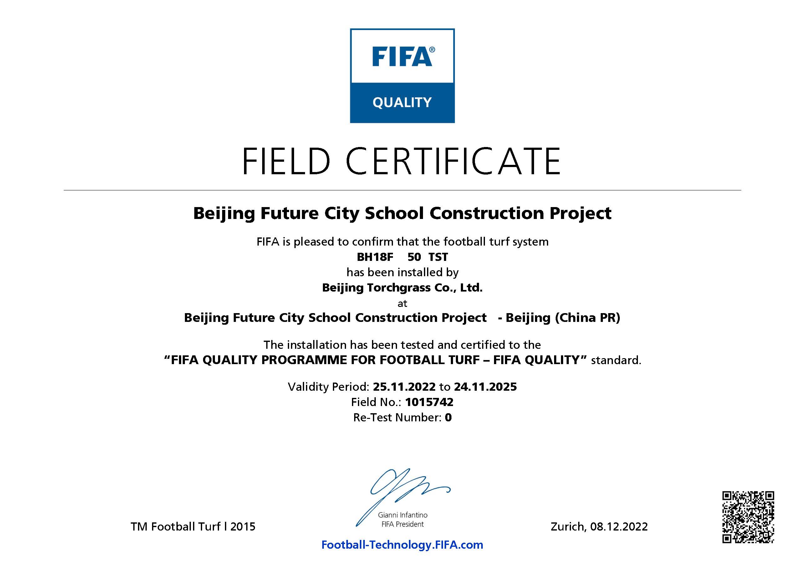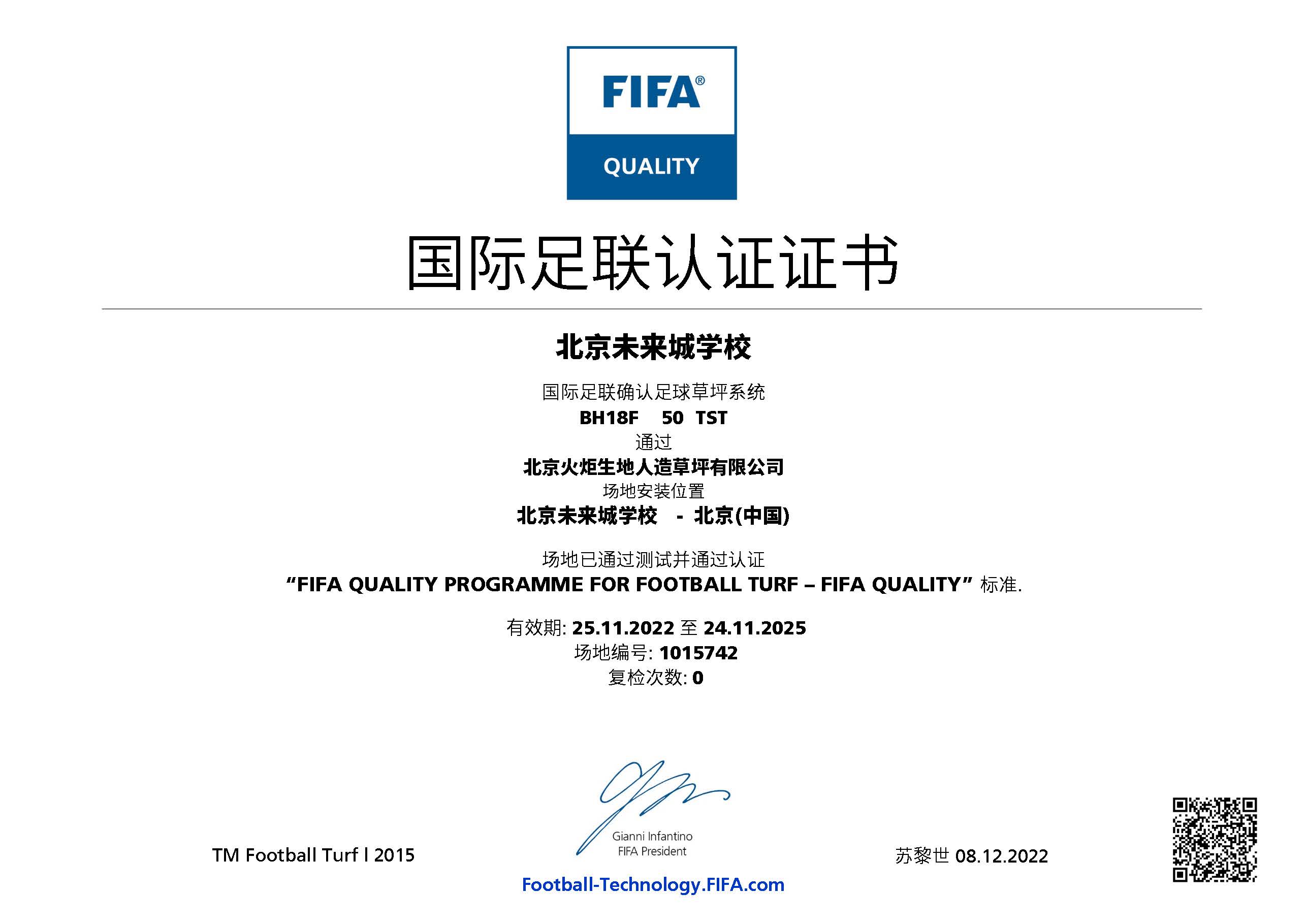 近日,北京未來城學(xué)校足球場已通過 FIFA(國際足聯(lián))人造草坪足球場地質(zhì)量標(biāo)準(zhǔn)的測試,榮獲 FIFA Quality 認(rèn)證證書。